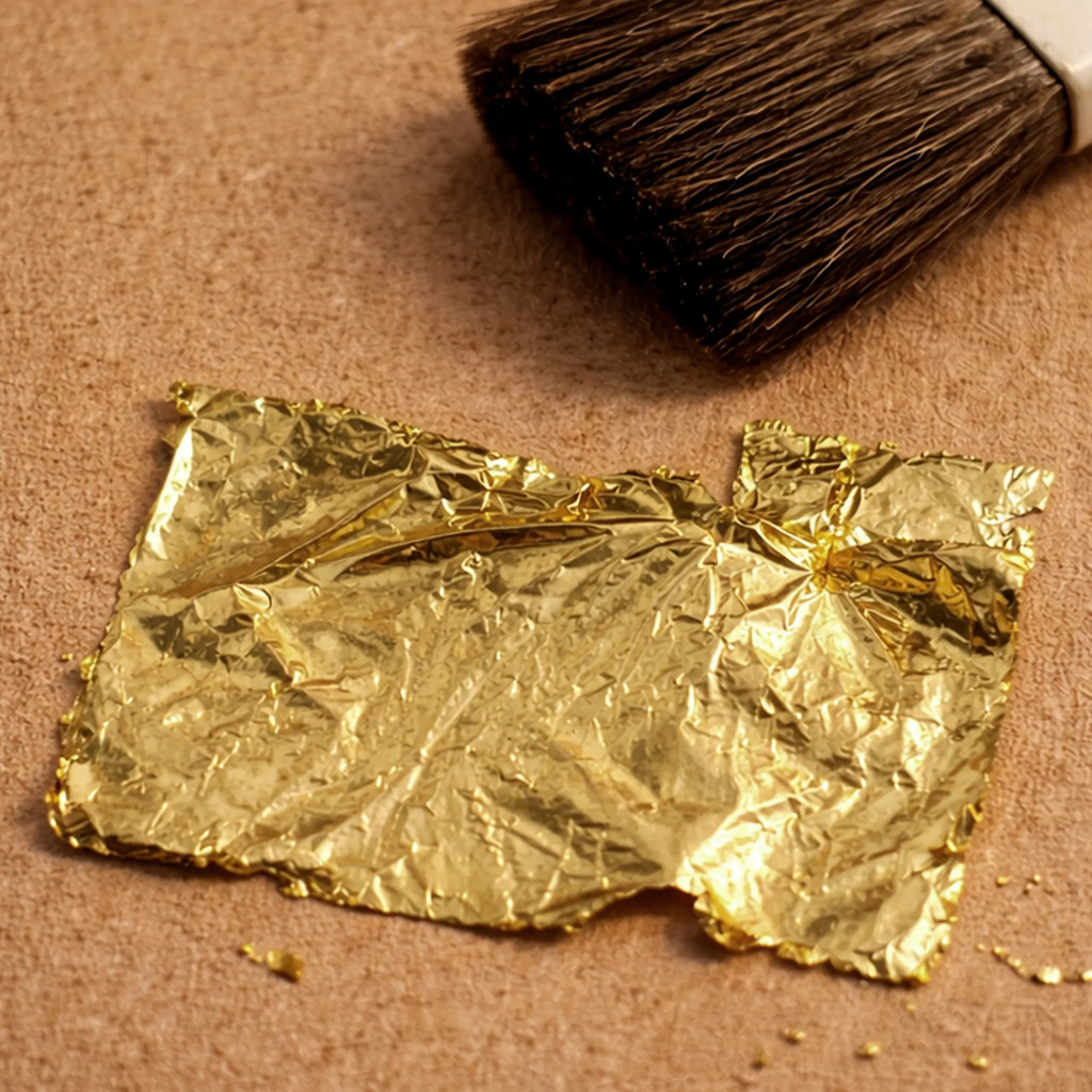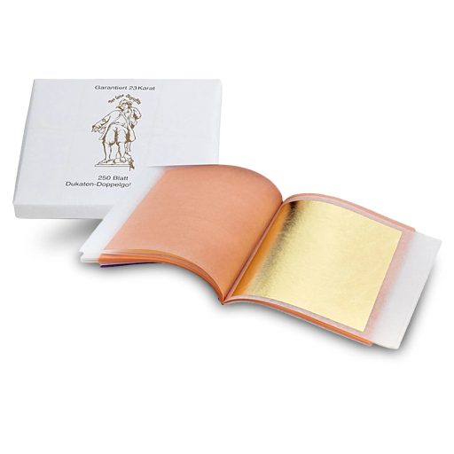 Finoman emeljük le a legfelső fémfóliát a csomagból egy speciális aranyozó (felhordó) ecset segítségével! A leemelés gyakorlott aranyozóknak nem jelent kihívást, de kezdőknek lehet, hogy érdemesebb a laponként elválasztott füstfólia füzetet választani.)