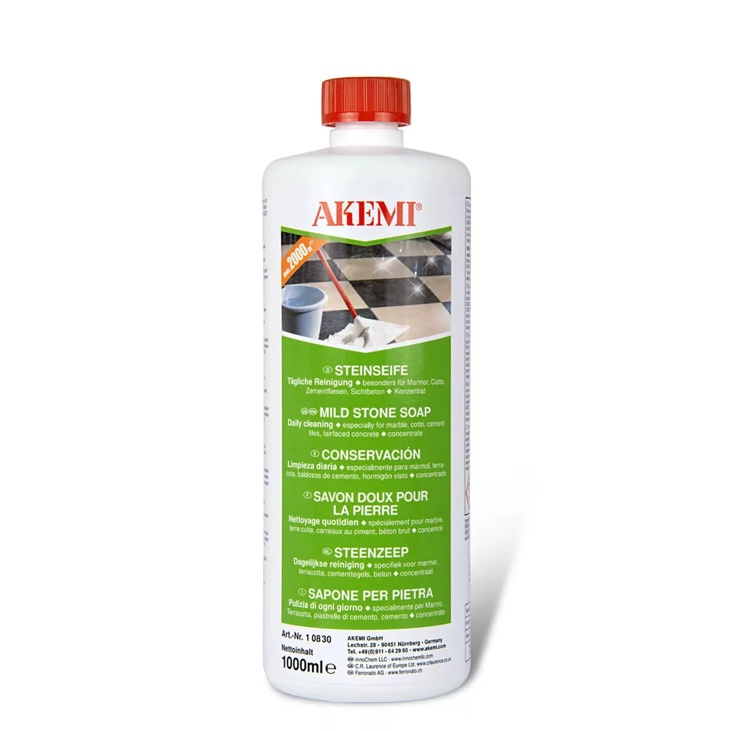 Az Akemi Mild Stone Soap egy koncentrált, magas minőségű tisztítószer, amely ápolóanyagokat, segédanyagokat és illatanyagokat tartalmaz. Foszfát-, lúg-, viasz- és polimermantes, valamint könnyen lebomló összetételével környezetbarát megoldást nyújt. Különleges formulája ideálissá teszi természetes és mesterséges kövek rendszeres tisztítására és ápolására. Rendszeres használata megvédi a követ, megőrzi annak szerkezetét és színét, ezzel hozzájárulva a felület tartós szépségéhez és állapotához.