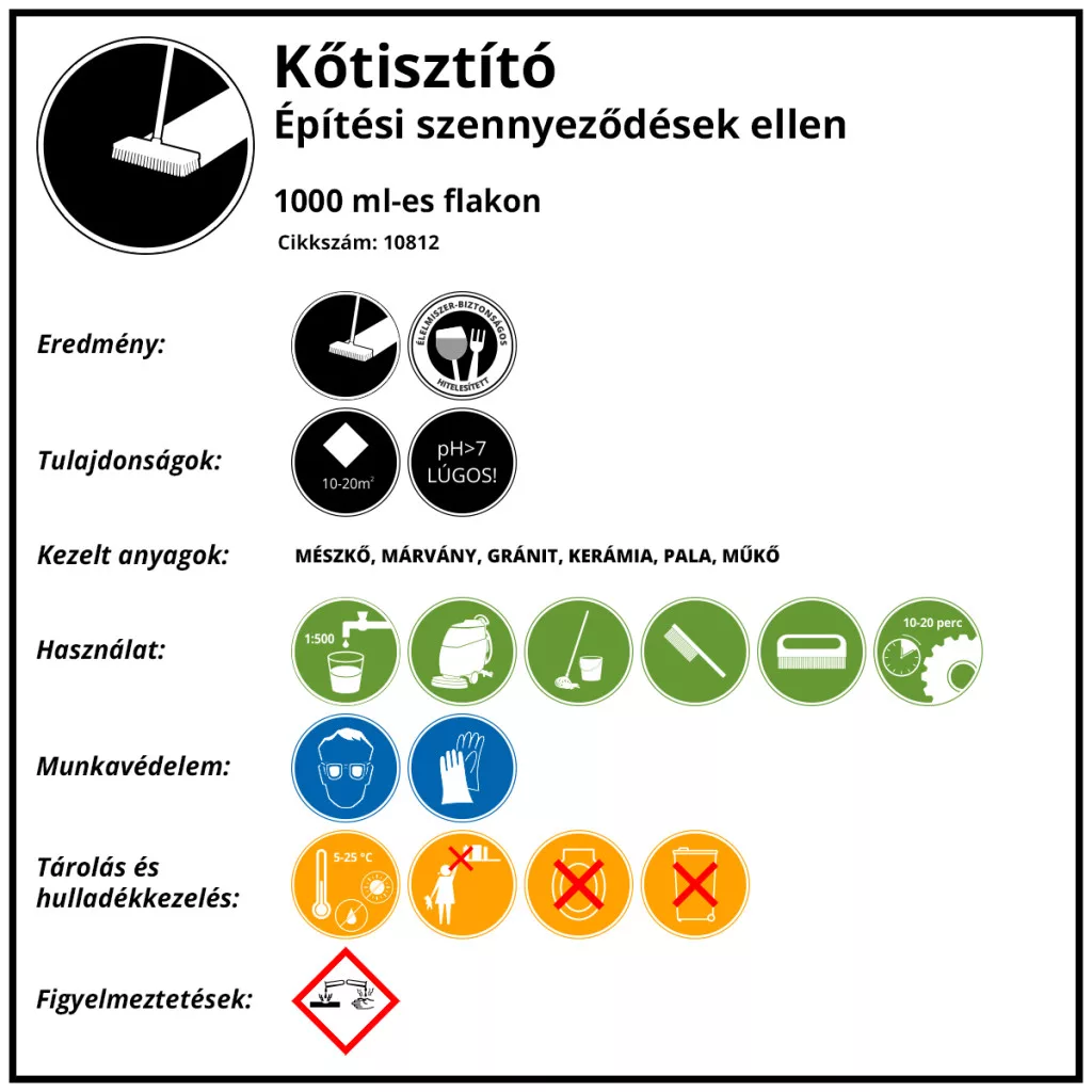 Különösen alkalmas építkezési szennyeződések alapos eltávolítására, például kőápoló és viaszrétegek, enyhe cementfilmek, olaj- és zsírfoltok, korom- és kátránylerakódások, szintetikus festékmaradványok, valamint vakolat eltávolítására. Alkalmazható természetes és mesterséges köveken, például márványon, travertinen, terrazzón, grániton, téglán, cotto lapokon, csempéken, látszóbetonon és finomkerámián.